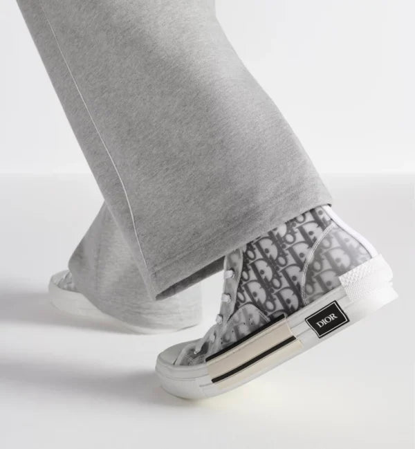 The B23 League high-top sneaker is set apart by its layering of transparent paneling and white and black Dior Oblique canvas. Essential details, such as eyelets and a lace-up front, a white rubber sole, a rounded and reinforced toe as well as a rear tab recall the codes of the classic high-top style. The sneaker is further enhanced with contrasting details on the sides, including a Dior signature, and pairs easily with any casual outfit.