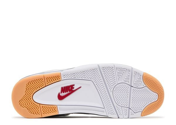 The Nike SB x Air Jordan 4 Retro SP ‘Navy’ sports a white leather upper with a grey suede forefoot overlay and side panel netting. A red Jumpman embellishes the tongue, while an embossed Nike SB logo adorns the navy heel tab. More navy accents decorate the eyelets and foam midsole, which showcases a visible Nike Air unit in the heel. A herringbone-patterned outsole uses gum rubber in high-wear areas for enhanced durability.